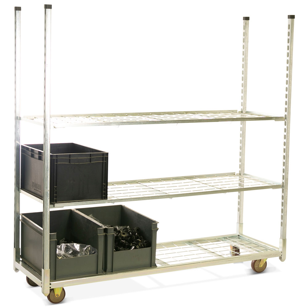 Nos chariots sur mesure sont fabriqués en acier galvanisé de haute qualité. Les chariots et les plateaux sont équipés d'un fond et d'une planche en fil d'acier, de sorte que la capacité de charge et la durabilité sont nettement supérieures à celles de la variante en bois.