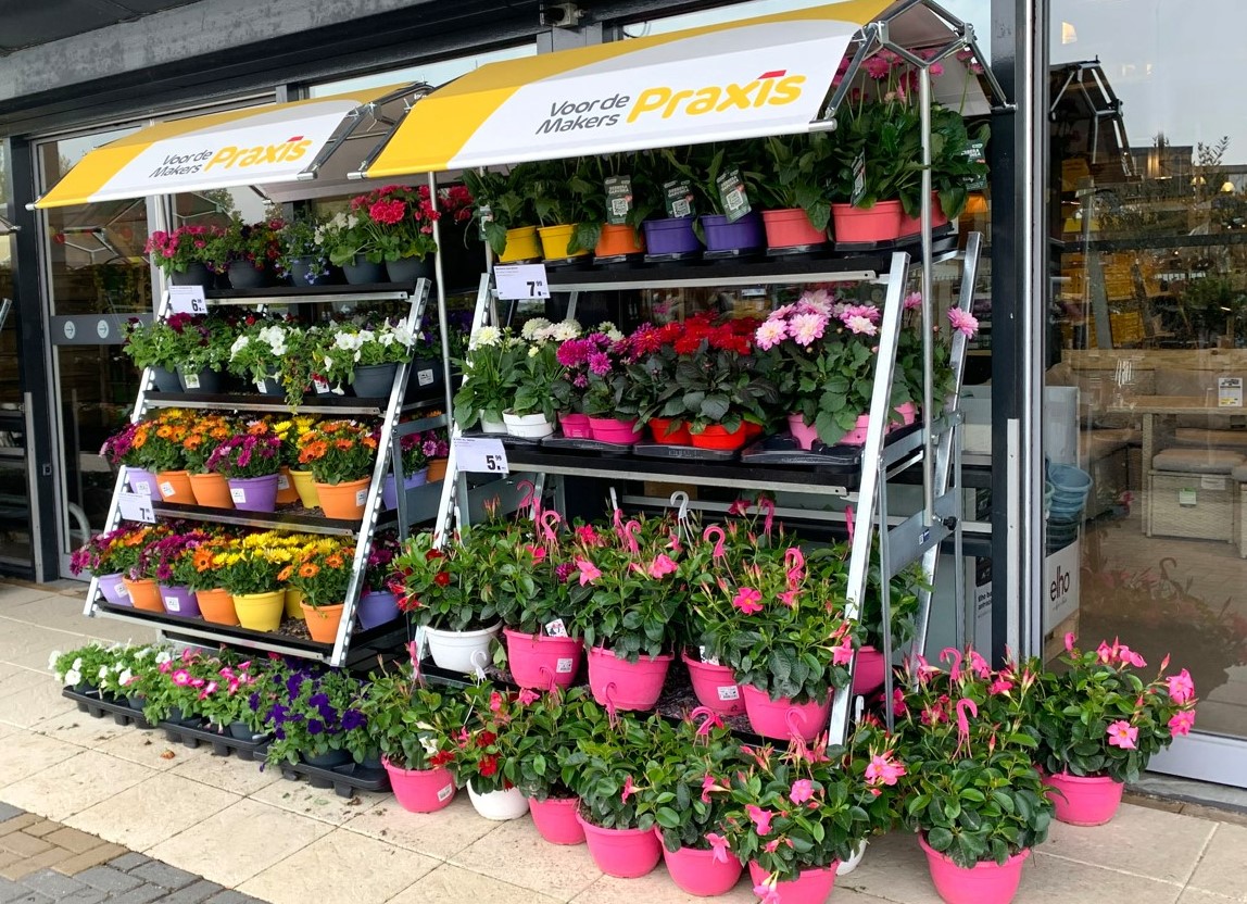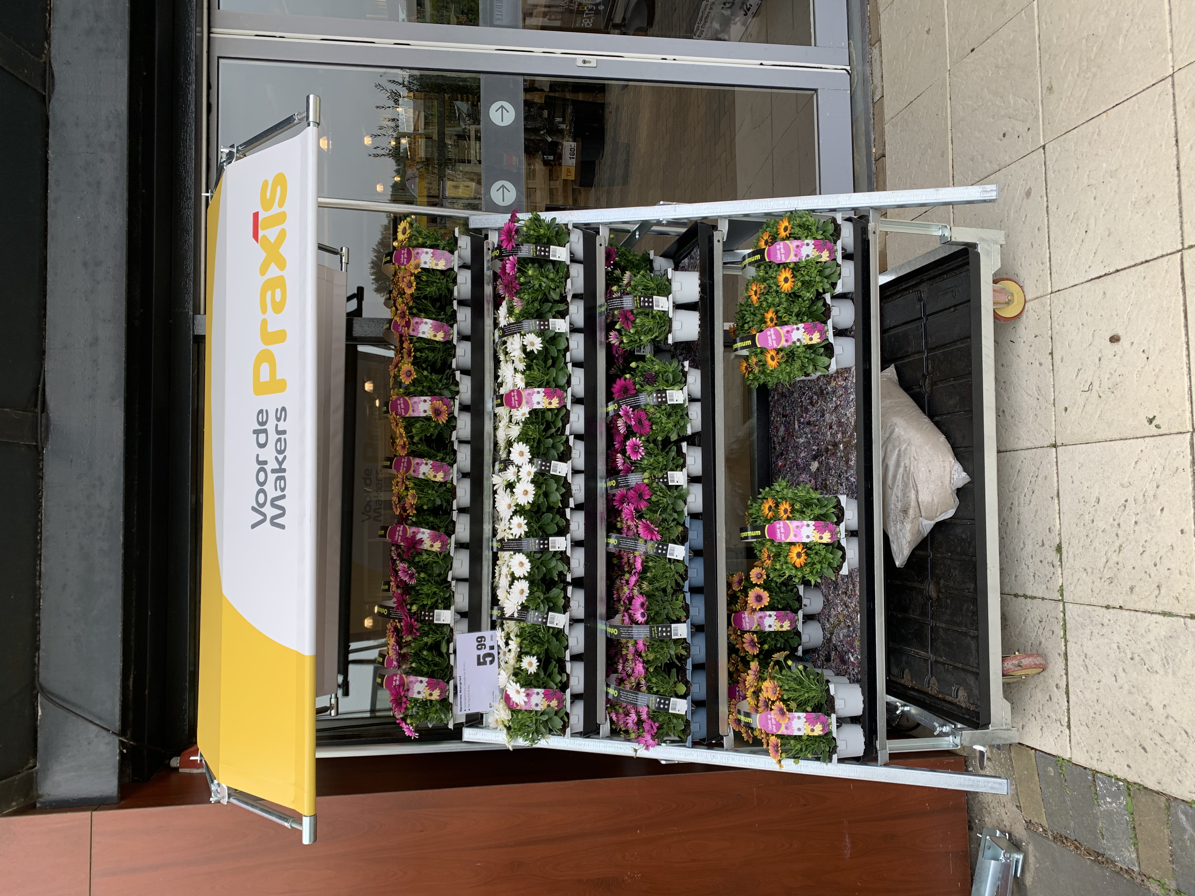 Praxis, l'un des principaux magasins de bricolage des Pays-Bas, vend également depuis des années un volume croissant de plantes à massif, d'annuelles d'été et de plantes vivaces. Ici aussi, notre Horti-Display, avec le toit en style maison, offre une valeur ajoutée en termes de présentation et donc plus de ventes, ainsi qu'une meilleure qualité de plantes au moment de la vente et finalement dans la maison du client.